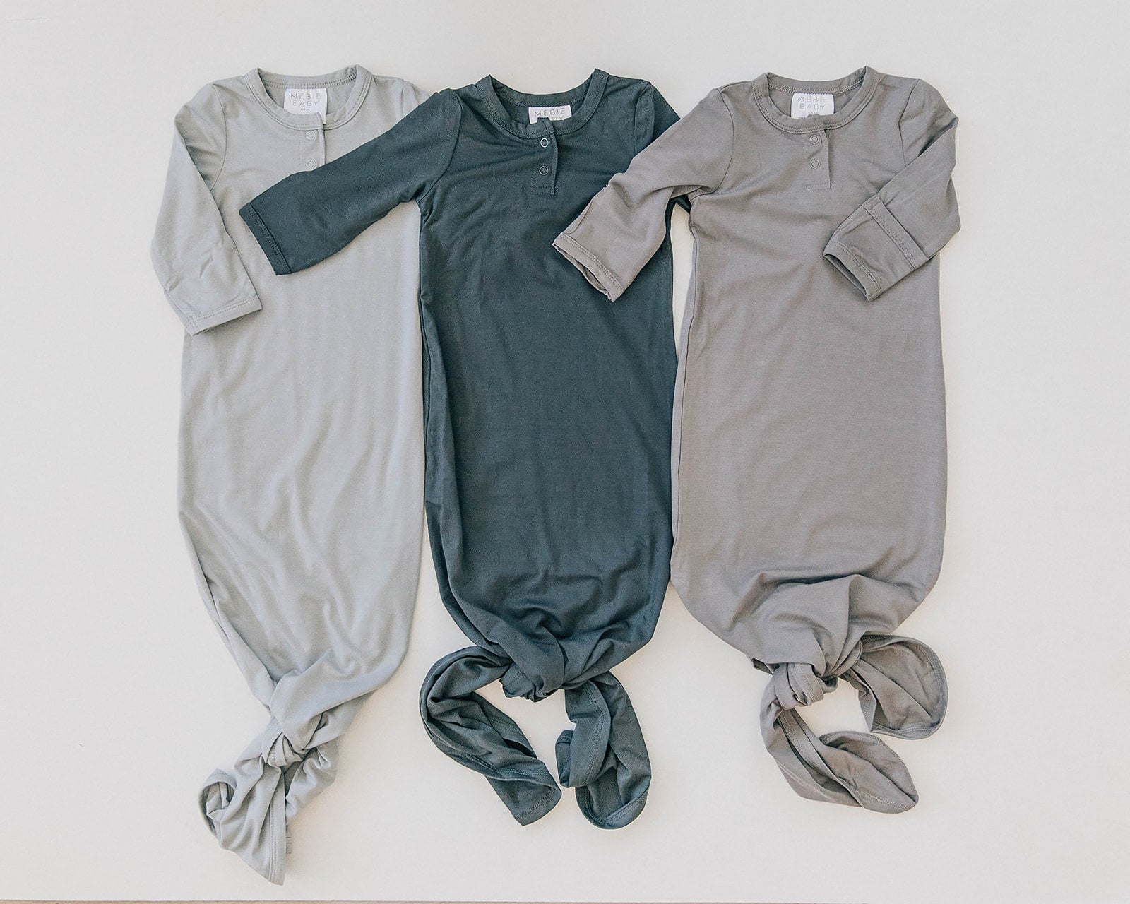 These gowns are size 0-3. They are made out of supremely soft Bamboo Rayon to keep your little one comfortable. We have a variety of gender neutral designs and colors making them perfect for any baby. They have fold over hands and two snaps for easy on and off. We also have shoulder flaps to make it easily pull over your little ones head, we want to make dressing your baby as easy as possible. The bottom is easily tied and untied in a knot for no-fuss diaper changes which makes it a newborn baby essential! These are made out of the same fabric as our stretch swaddles and match the colors of the stretch swaddles, head wraps, and hats.