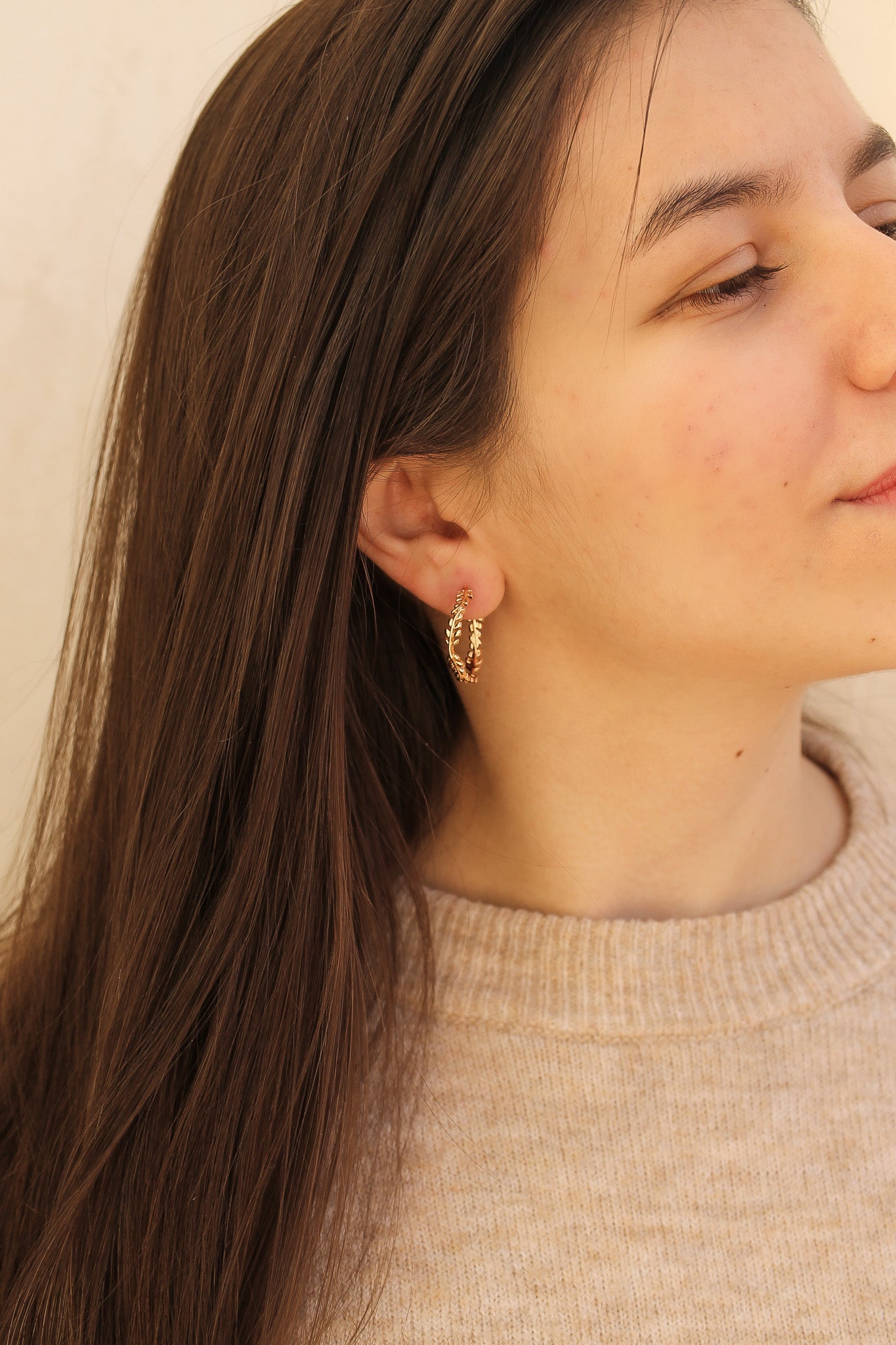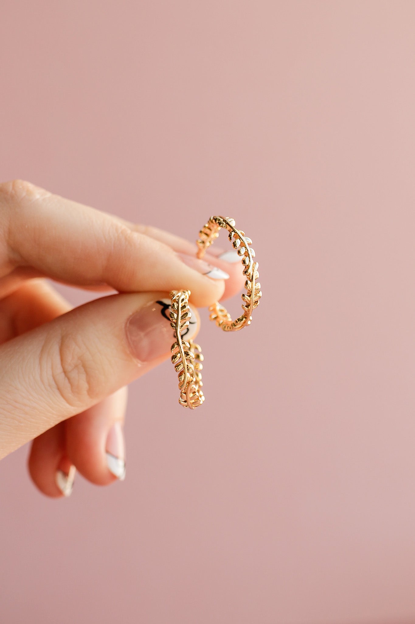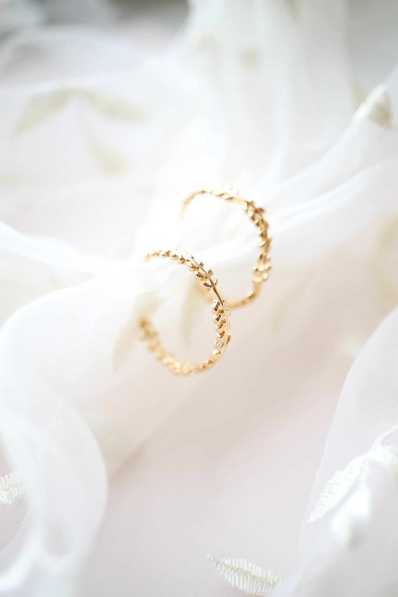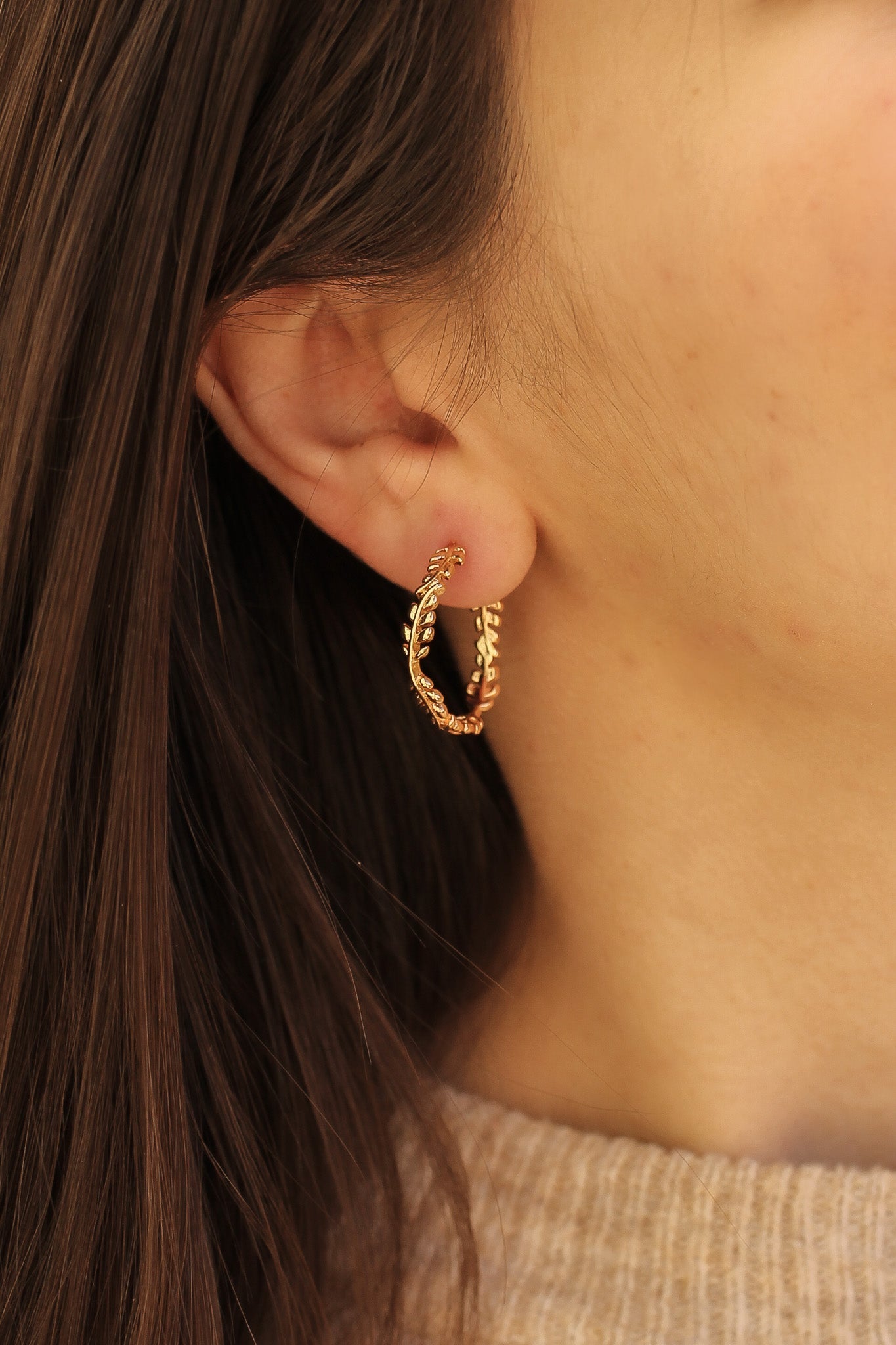 She is so dainty, the perfect size, and perfect for formal and casual outfits alike! She is a basic that is not at all basic. The laurel wreath branches give it more of an elevated and unique look than a traditional hoop, and it definitely makes the whole earring feel more feminine and ethereal too.